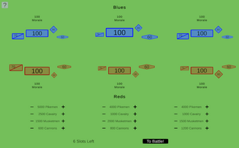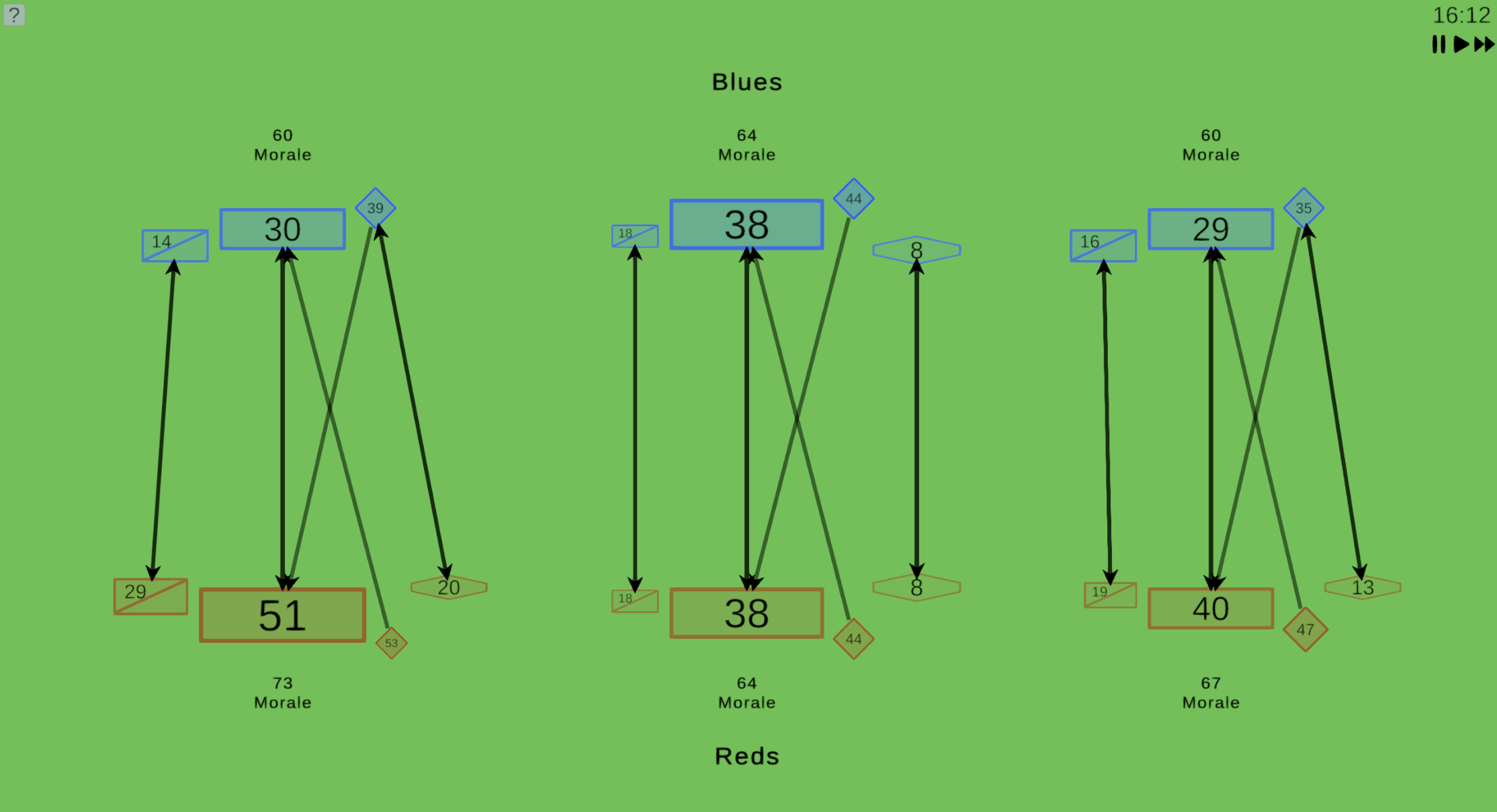 The aim of the experiment is to find a historically inspired model of warfare that highlights the interdependence of different military arms without forcing an artificial rock-paper-scissors style of balancing. Here, the variation in power, flexibility, cohesion, and deployment schedule of the 4 arms do that naturally. There is plenty of room for adding more detail (ie, choosing between pikemen and halberdiers), extra mechanics (variations based on terrain or the general), and mapping it to other time periods (plausibly from the bronze age to the ACW).