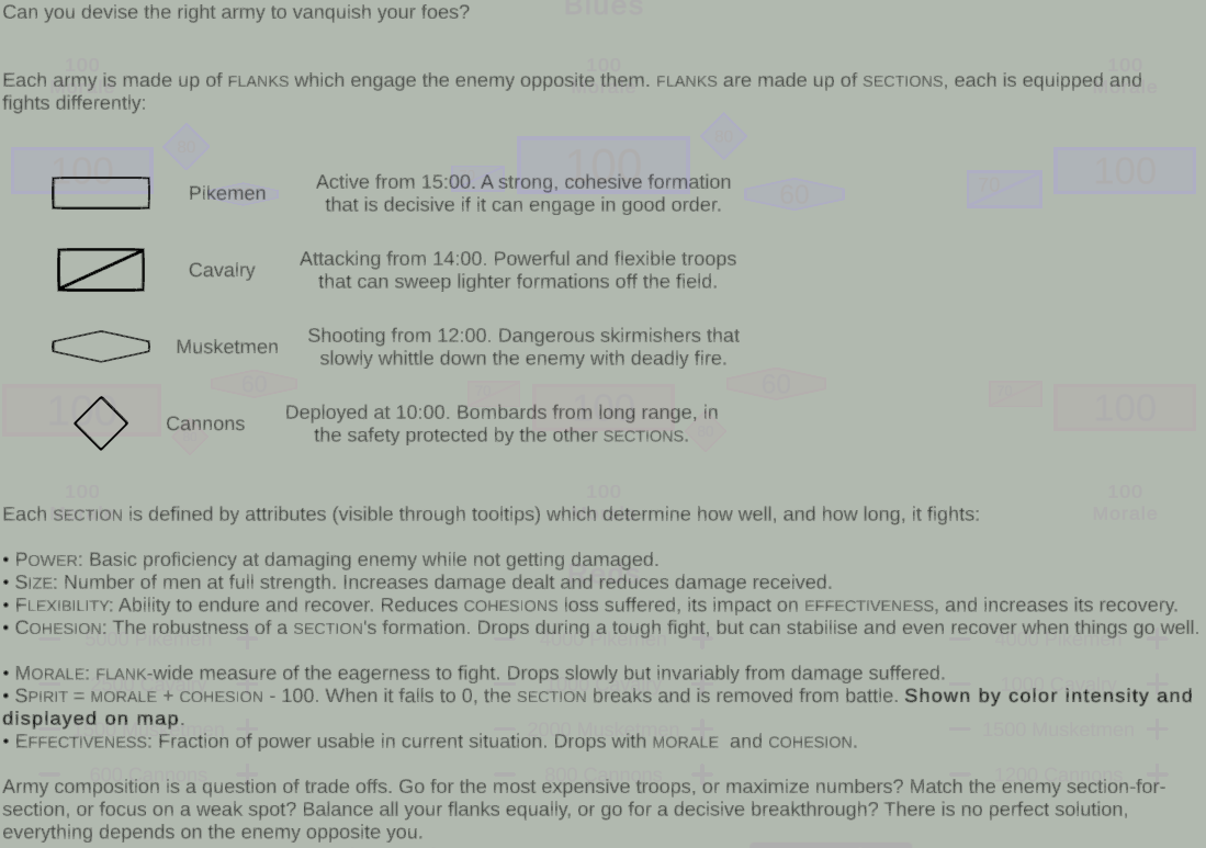 An experimental auto-battler that focuses on combined arms in the pike & shot era. Find the right balance of troop types on the right flanks to win the battle. And then try to do it even better!